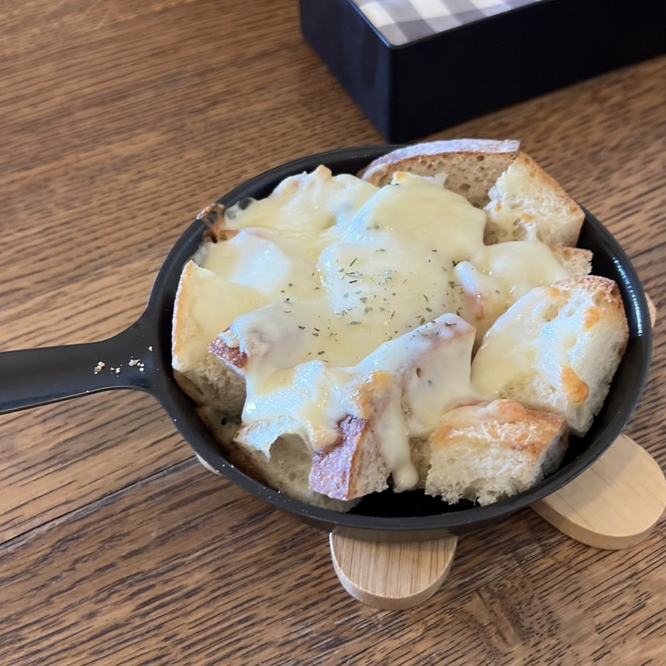 さきほどのりんごの木が鍋敷きになり、アツアツのチーズパンのスキレットが乗りました。