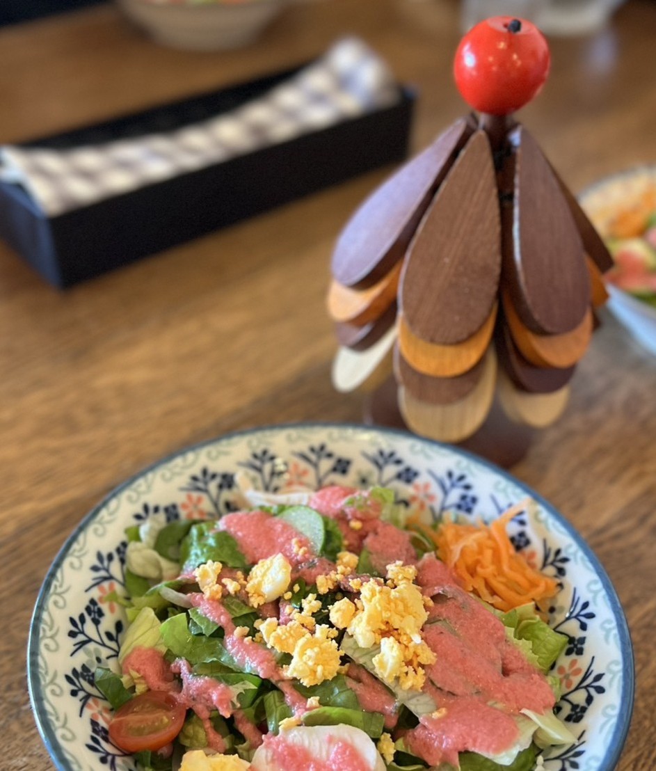 カラフルで元気になりそうなサラダと、隣にあったりんごの木がかわいい。