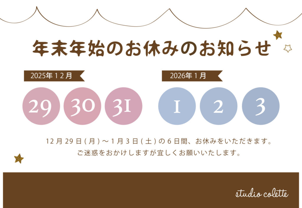 年末年始のお休みのお知らせ 2025.12.20 いつもスタジオコレットをご利用頂きありがとうございます。 今年もあと数日ですね! イベントがたくさんのこの季節、インフルエンザに気をつけて楽しんでくださいね。 当店は12/29(月)〜1/3(土)まで年末年始のお休みをいただきます。 12/28(日)18:00以降のお問合せには、1/4(日)より順次ご返信させていただきます。 どうぞ皆様、良いお年をお過ごしください。